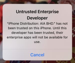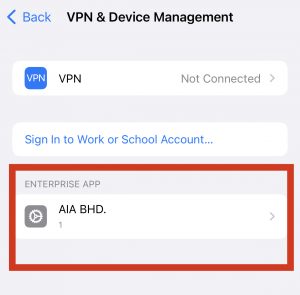 Tap the name of the developer profile – AIA BHD under the Enterprise App heading to establish trust for this developer.